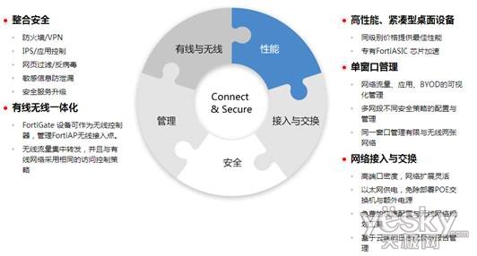 Fortient的Connect & Secure中小企业一体化解决方案,其核心产品是最近新发布的FortiGate D系列综合网关。FortiGate D系列设备应用了第二代的FortiASIC SOC平台,在性能以及效能方面又有了大力的提升,且硬件设备均设置了PoE接口,例如FortiGate-140D-PoE最多支持40个千兆以太网接口,其中16个接口为POE接口,既简化了电路部署,免去了PoE交换机与额外电源的费用开支,还满足了多种接入设备,例如无线接入FortiAP,即刻就构建了无线网络,且无线与有线网络可同窗口管理,配置相应的安全策略,真正做到中小企业网络一体化的至简致用部署。