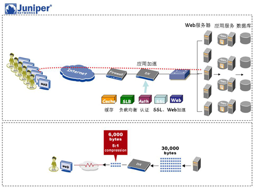 针对该企业反映的情况我们选择了 Juniper DX 应用加速平台系列产品,利用 DX 应用加速平台,通常可使访问业务关键应用的时间缩短一半, 极大地提高应用可用性,尤其对远程和分支机构用户更为有效。 DX 平台可实时优化并压缩所有发出的 Web 数据,而且时延几乎可以忽略不计,用户可以快速加载页面,不受位置和网络连接的影响。而且 DX 应用加速平台提供了完全的第 4 层至第 7 层服务器负载均衡功能,可在单一设备上支持多个应用和服务器集群的部署。