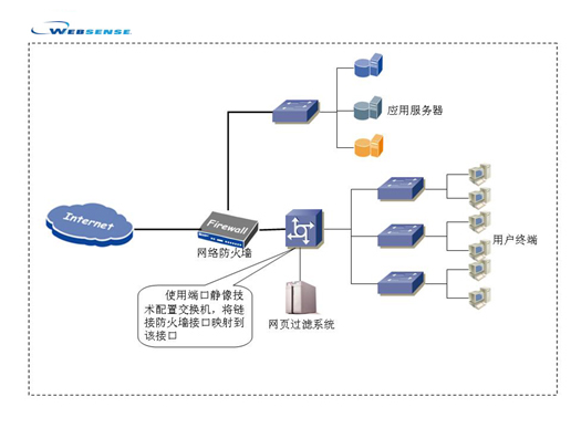 根据用户需求我们采用了 Websense Web Filter 网页过滤系统,此系统提供了一套完整的网页过滤机制,可以根据企业自身的业务需求及互连网使用情况灵活的定制过滤机制。同时强大的报告与分析工具能让网络管理人员详细了解网络中网站访问情况及网络中带宽使用情况。而且 Web Filter 系统可以分时段配置不同的访问规则,如在工作时段不允许访问体育、娱乐类网站,而下班和午餐时间允许访问。